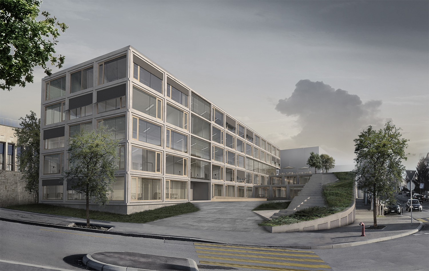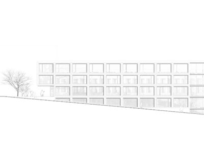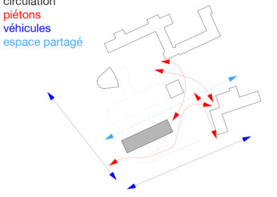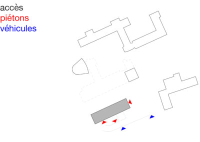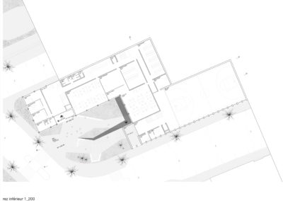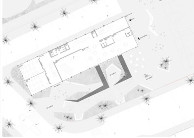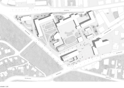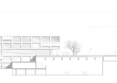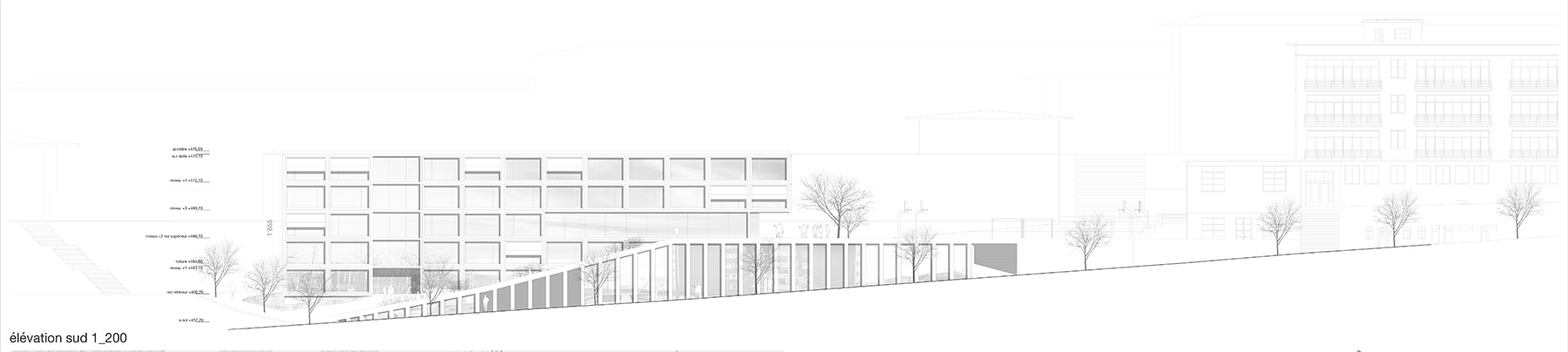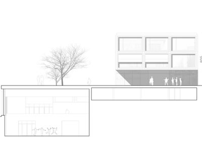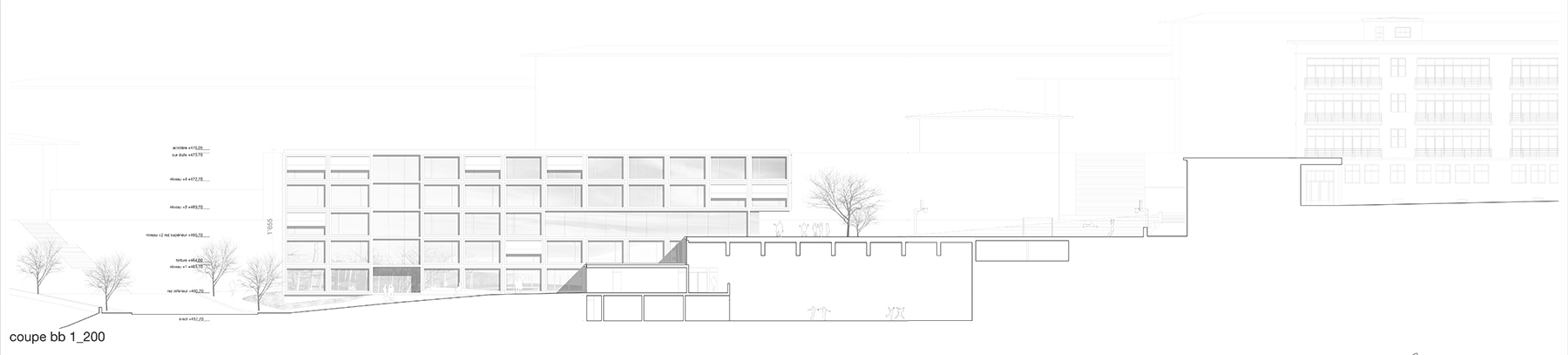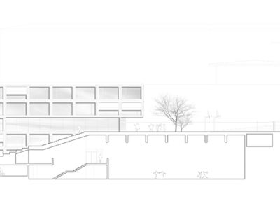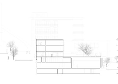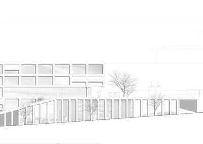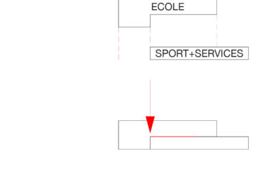 Le projet reprend les codes du complexe des années 50, une barre posée sur un socle comprenant la salle de sport et les services, sur lequel est perché le préau. Un escalier monumental permet de lier les flux des élèves entre l’angle constitué des Avenues du Belvédère et Marc-Dufour au chemin des Croix-Rouges. Cet escalier sert à la fois de transition entre le bas et le haut mais également de préau, il est aménagé en gradins et terrasses afin d’en faire un lieu de vie ludique pour les élèves et promeneurs. Le préau supérieur est prolongé sur le chemin des Croix-Rouges en un espace partagé entre piétons et voitures. Cet espace devient un élément de centralité liant les trois collèges : le Belvédère, les Croix Rouges et la nouvelle extension. Les salles de classes et salles spéciales se trouvent dans la barre posée sur le socle. Toutes les salles bénéficient de lumière naturelle directe. La distribution se fait par un couloir en façade nord, les noyaux de services y sont articulés de manière à favoriser les espaces de rencontre entre élèves. Le socle regroupe les espaces de service ainsi que la salle de sport. Tous les éléments du programme peuvent fonctionner de manière autonome ou comme un seul et même bâtiment lorsque celui-ci est utilisé en mode «jour».