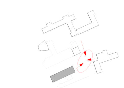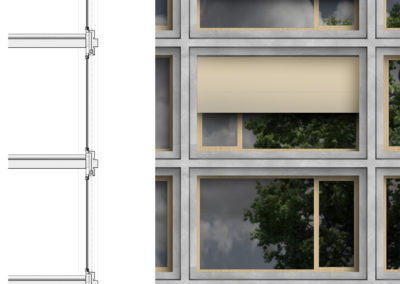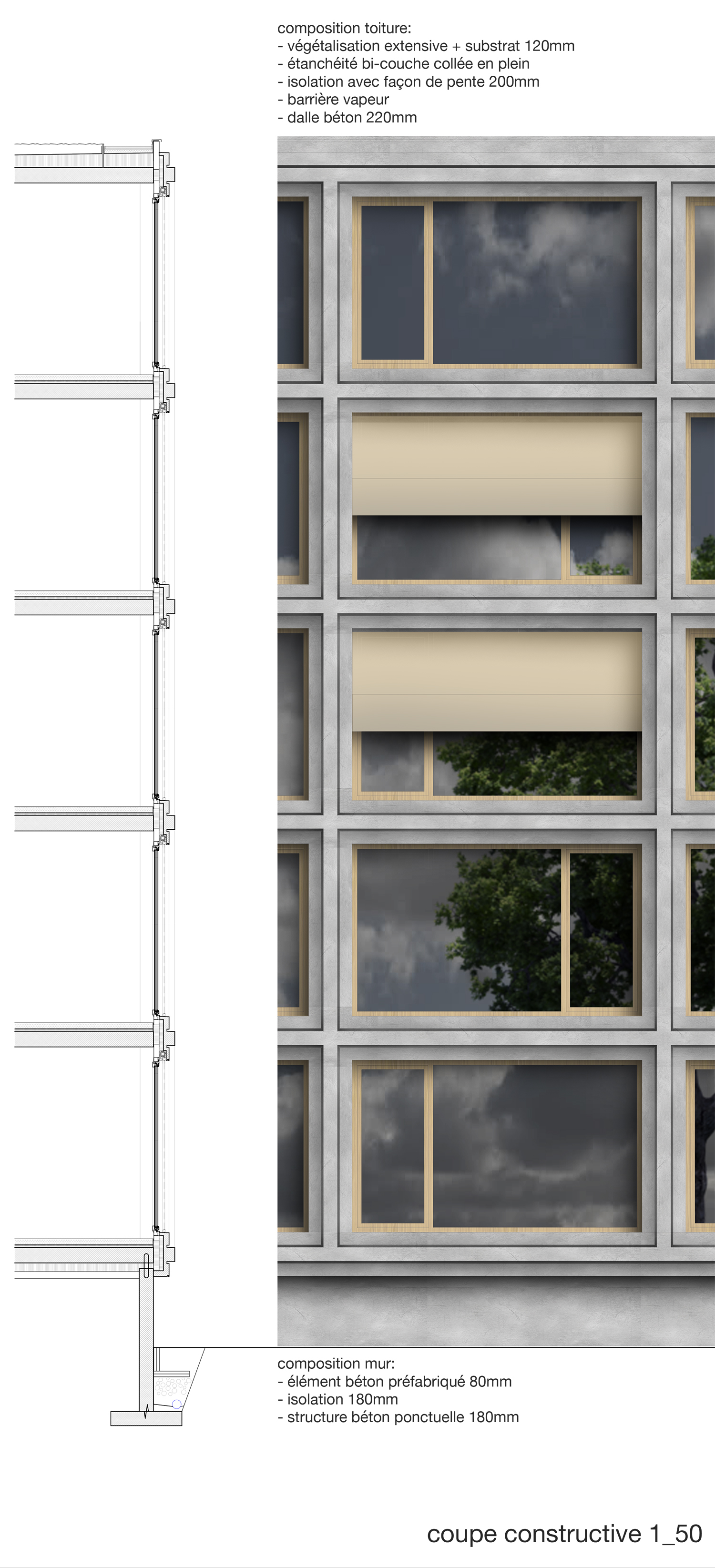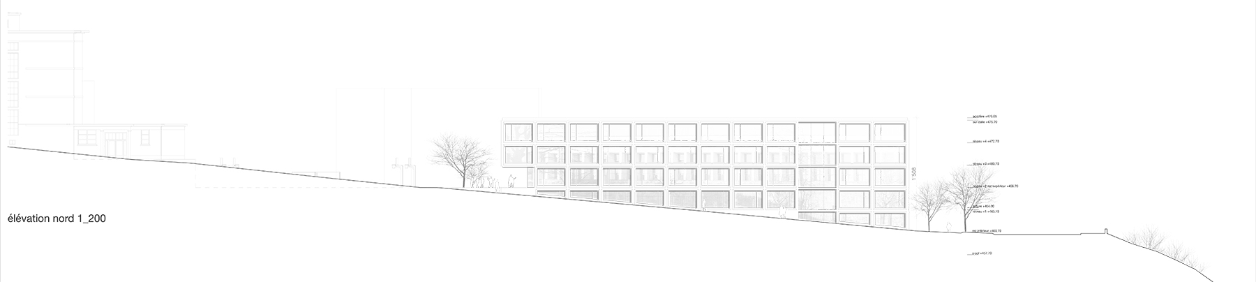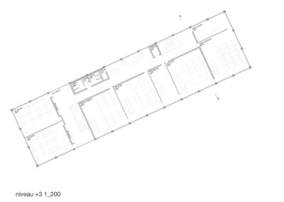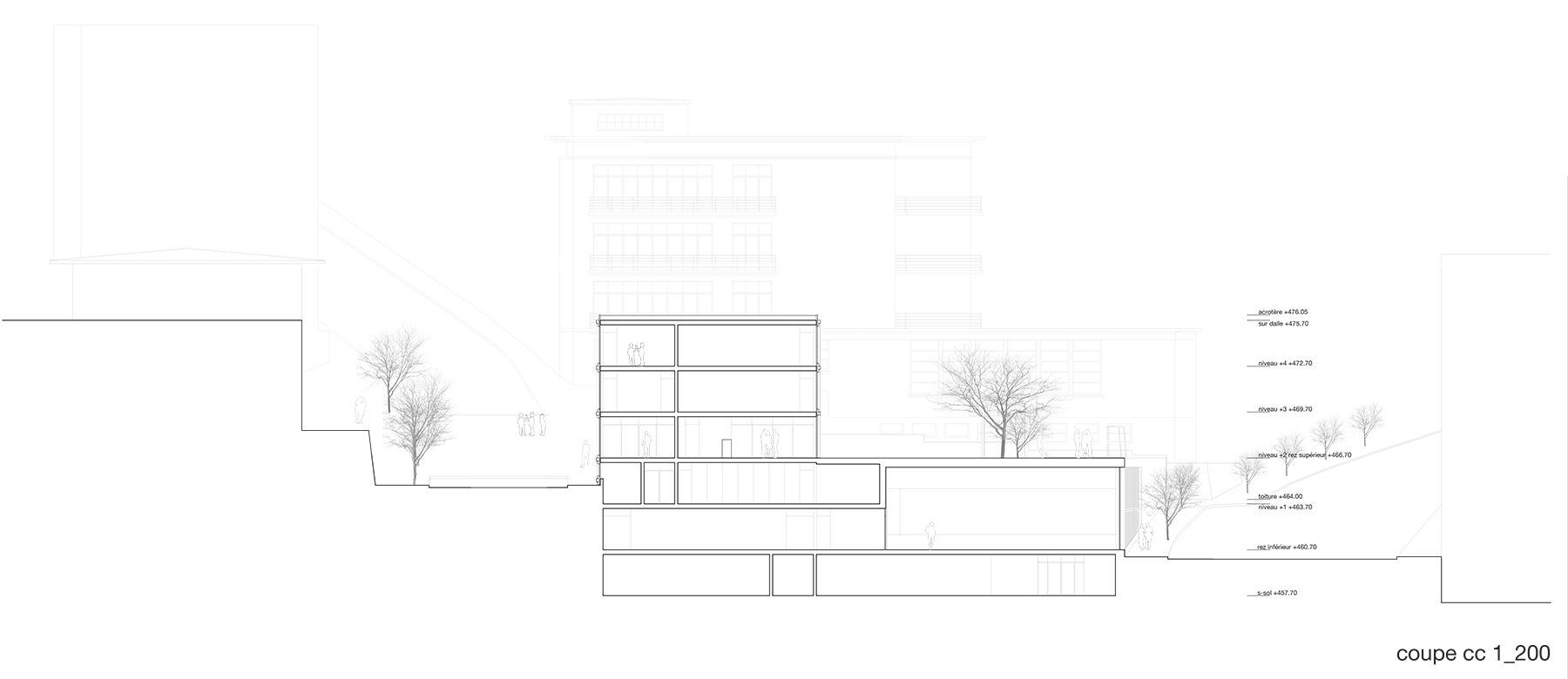 Le projet reprend les codes du complexe des années 50, une barre posée sur un socle comprenant la salle de sport et les services, sur lequel est perché le préau. Un escalier monumental permet de lier les flux des élèves entre l’angle constitué des Avenues du Belvédère et Marc-Dufour au chemin des Croix-Rouges. Cet escalier sert à la fois de transition entre le bas et le haut mais également de préau, il est aménagé en gradins et terrasses afin d’en faire un lieu de vie ludique pour les élèves et promeneurs. Le préau supérieur est prolongé sur le chemin des Croix-Rouges en un espace partagé entre piétons et voitures. Cet espace devient un élément de centralité liant les trois collèges : le Belvédère, les Croix Rouges et la nouvelle extension. Les salles de classes et salles spéciales se trouvent dans la barre posée sur le socle. Toutes les salles bénéficient de lumière naturelle directe. La distribution se fait par un couloir en façade nord, les noyaux de services y sont articulés de manière à favoriser les espaces de rencontre entre élèves. Le socle regroupe les espaces de service ainsi que la salle de sport. Tous les éléments du programme peuvent fonctionner de manière autonome ou comme un seul et même bâtiment lorsque celui-ci est utilisé en mode «jour».