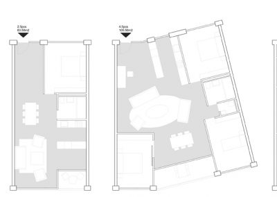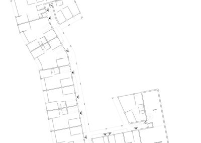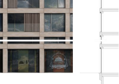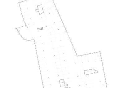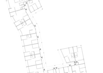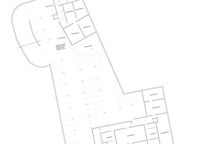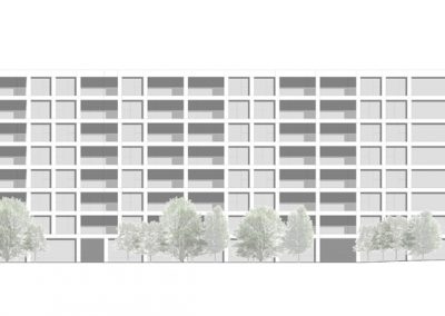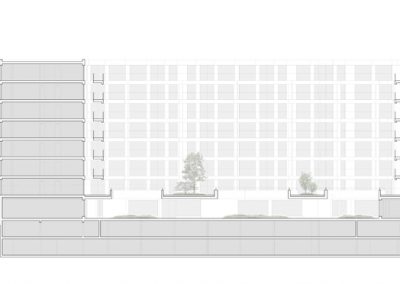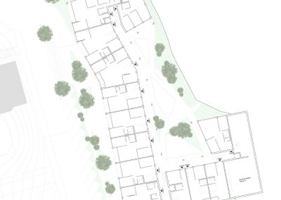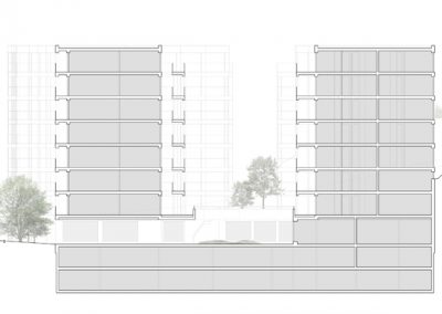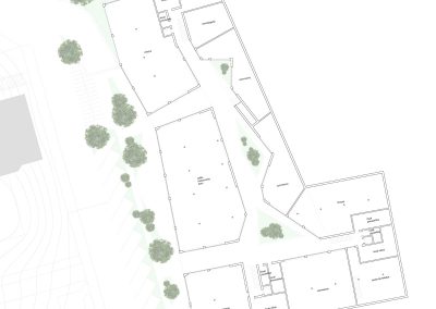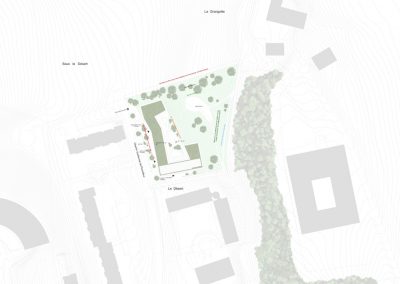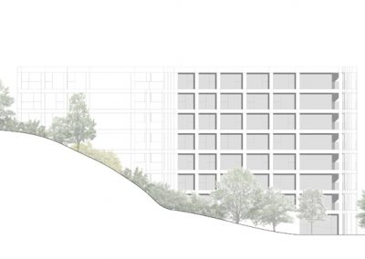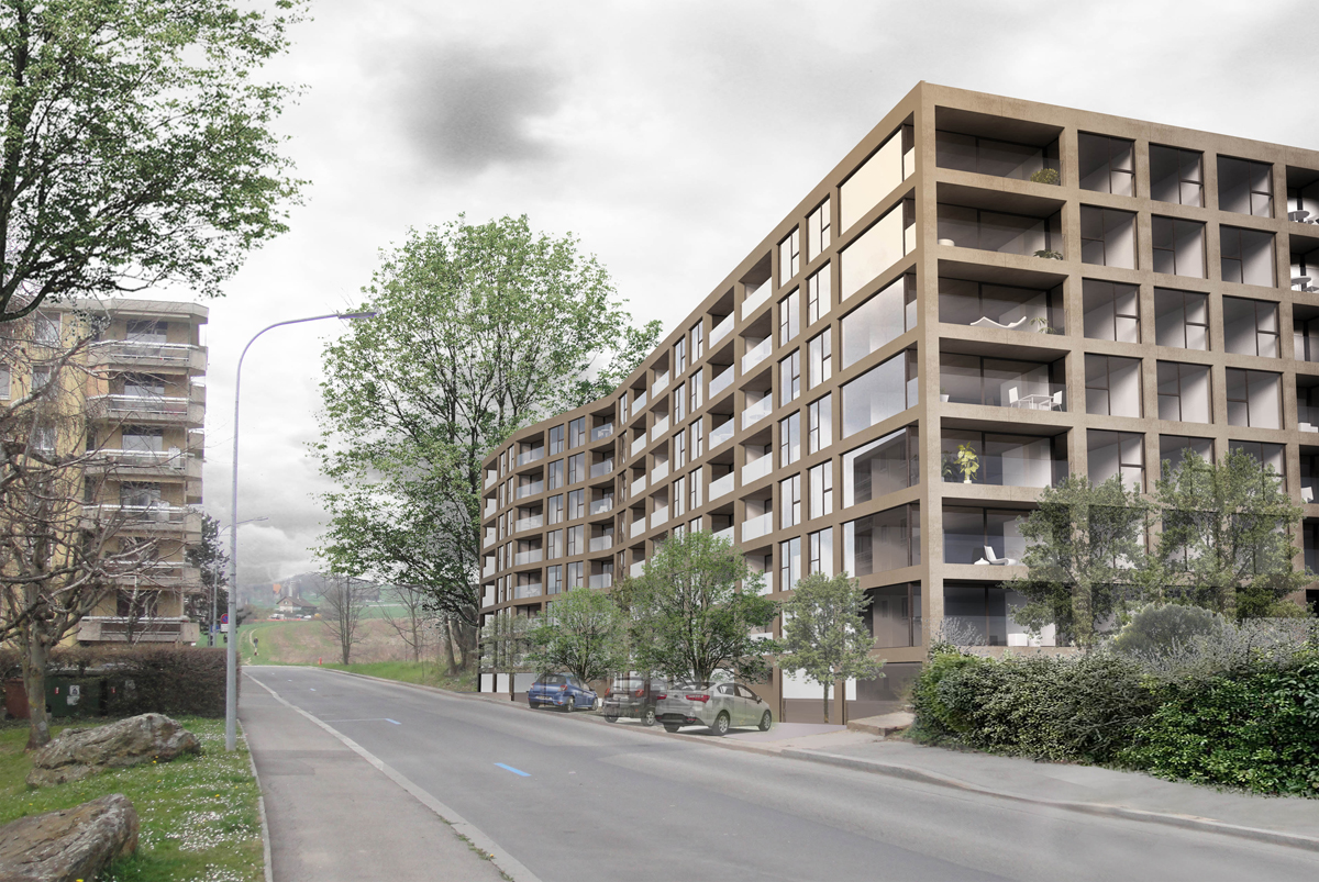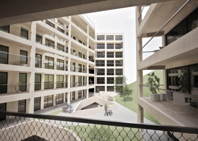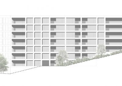 Le bâtiment s’implante conformément au plan de quartier. Au Sud il vient chercher l’alignement du bâtiment voisin. Il est par contre en retrait en son centre en partie ouest, de manière à créer une place publique et également de se détacher du bâtiment lui faisant face. La galette du rez-de-chaussée résulte du travail de la coupe, elle est traitée comme une galerie marchande, regroupant les activités et les circulations. Trois passages au travers du bâtiment permettent d’atteindre les divers éléments et de rallier l’est de la parcelle. A l’étage elle fait office de cour intérieure. Au lieu de nier la butte et la forte déclivité du terrain, le bâtiment l’encercle et la fait entrer en son sein. De cette manière les logements bénéficient d’un maximum de lumière naturelle. La distribution des appartements se fait par l’intermédiaire de trois cages d’escalier reliées à des coursives. Ces dernières sont volontairement surdimensionnées afin de pouvoir offrir aux appartements des espaces extérieurs supplémentaires côté cour intérieure. Chaque appartement bénéficie d’une double voir d’une triple orientation grâce au principe de coursive-balcon.