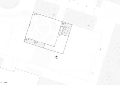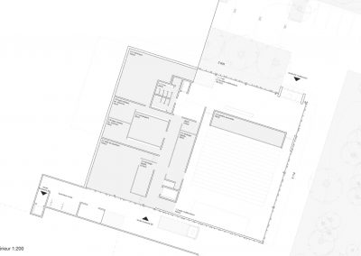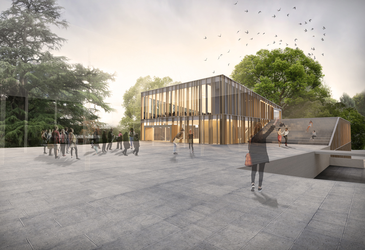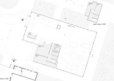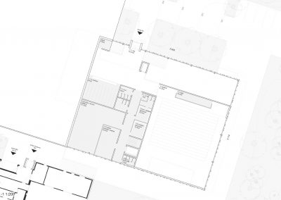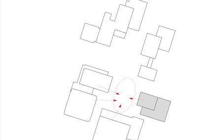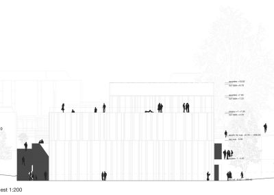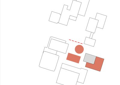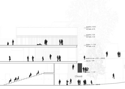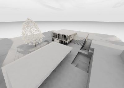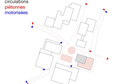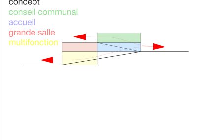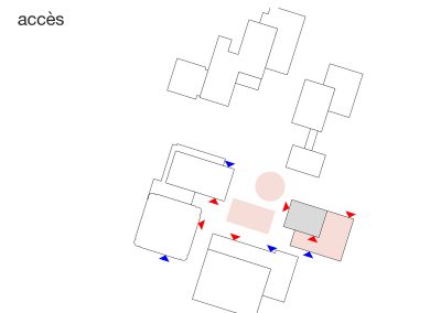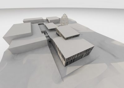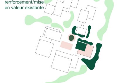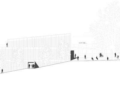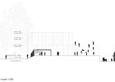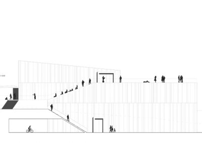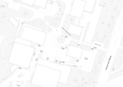Le bâtiment assume le rapport à la pente ainsi que les contraintes réglementaires. Le travail le long de la pente et en coupe permet au programme de s’inscrire naturellement dans le paysage dégageant ainsi des espaces collectifs extérieurs. Par son insertion dans le tissu existant, il crée une place centrale occupée par le couvert fédérant les programmes des bâtiments BIII, BIV et BV. Le nouveau volume créé propose un espace collectif surélevé de la place principale pouvant accueillir des manifestations publiques extérieures tout en profitant des infrastructures intérieures du bâtiment. L’espace de liaison entre la place centrale et l’espace en toiture est traité comme un théâtre extérieur permettant le déroulement de représentations en plein air. L’accès principal se trouve directement au niveau de la place centrale côté Ouest tandis que les accès de livraison pour le bâtiment BV et BIII se font depuis l’Est de manière à éviter les croisements de flux entre piétons et véhicules. La place centrale est uniquement accessible aux piétons. Des liaisons couvertes depuis les différents bâtiments sont créées permettant de rejoindre le couvert à l’abri des intempéries.