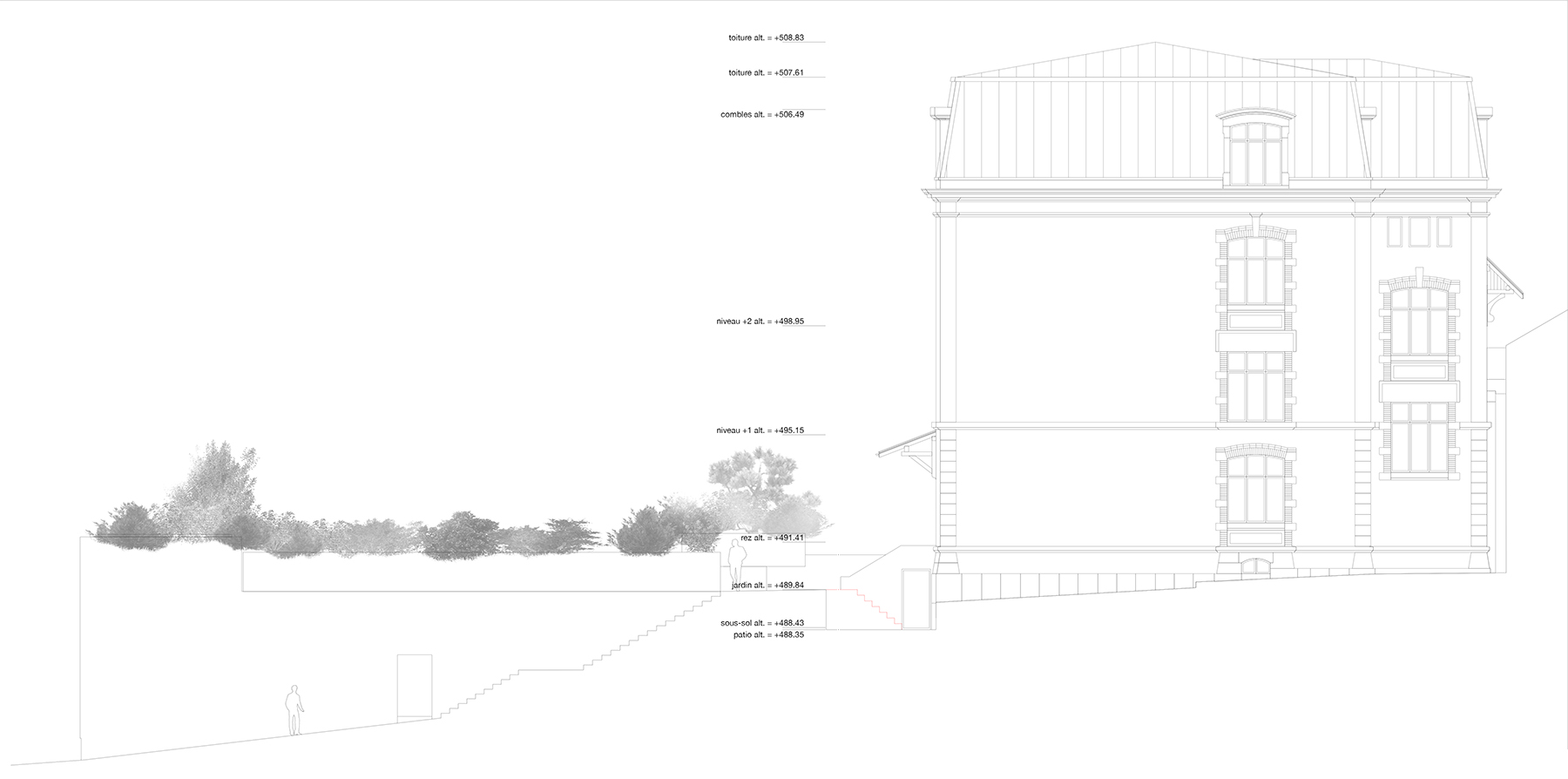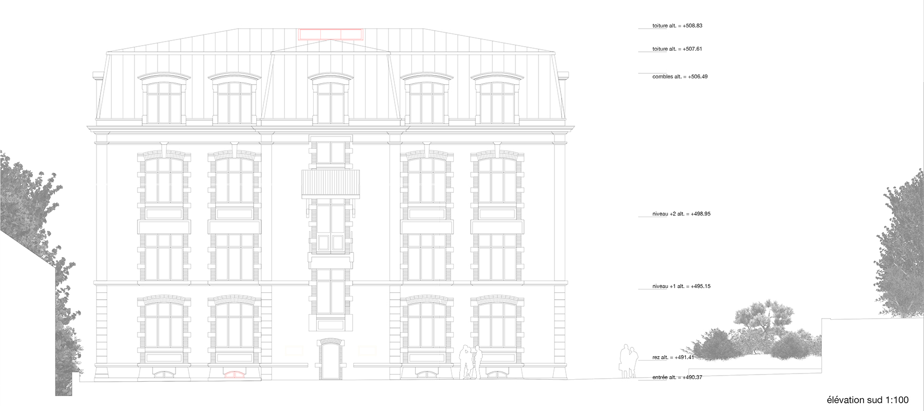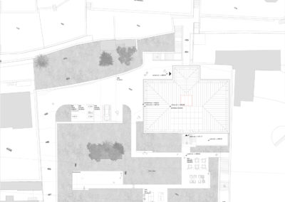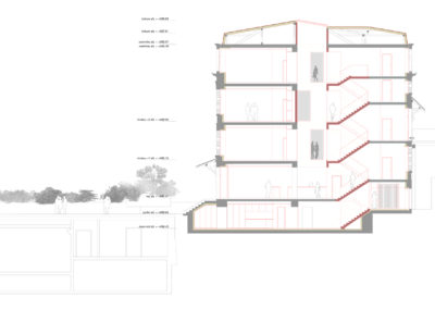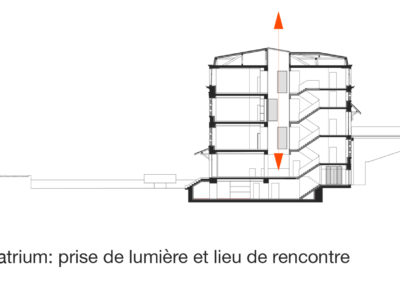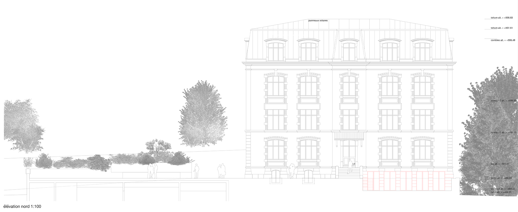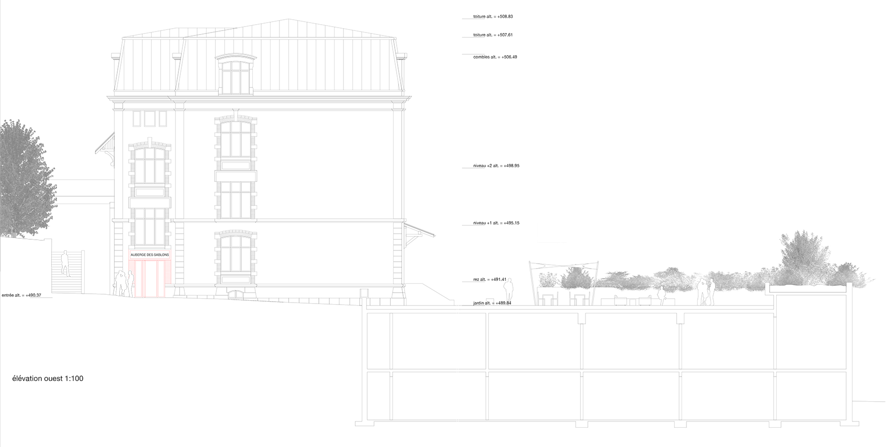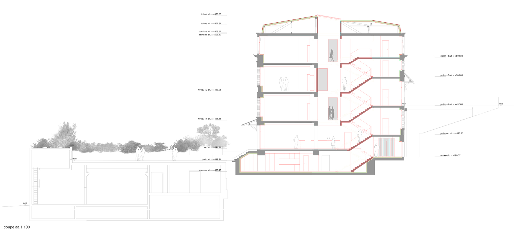 Le projet prend le parti de faire entrer la lumière au centre du bâtiment par la création d’un atrium central regroupant les circulations horizontales et verticales. Il permet de favoriser les échanges par l’intermédiaire de jeux de vues créés par les fenêtres intérieures et les zones de rencontre. Le projet garde la trace des structures existantes en renforçant l’axe nord-sud propre au plan initial et conserve la volumétrie du bâtiment existant. La toiture se pare d’une couverture en cuivre pour démarquer le caractère spécifique du type d’ouvrage en rapport avec les bâtiments avoisinants. La couleur cuivre est là pour rappeler la couleur rouge orangée des toitures en terre cuite des bâtiments du quartier du Sablon. Dans les étages les services sont regroupés au centre en formant des noyaux. Outre le fait de rationaliser les gaines techniques, ce dispositif permet de créer une zone « tampon », semi-privée entre le couloir et la chambre, garantissant ainsi une certaine intimité lors du change et de la toilette. Les aménagements extérieurs s’inscrivent dans un esprit de parc sur un socle rappelant la topographie en murs de vignes du quartier.