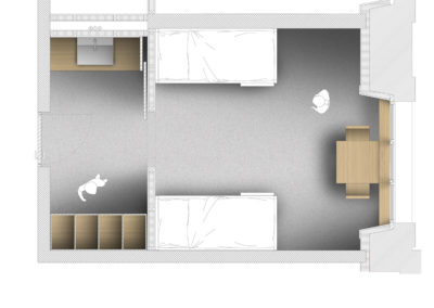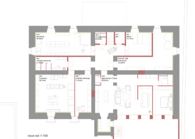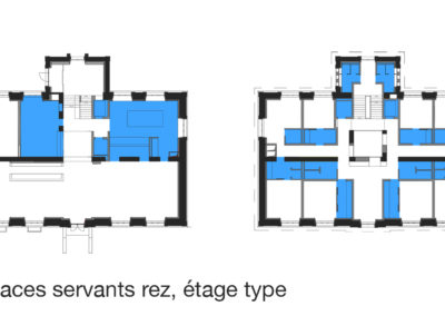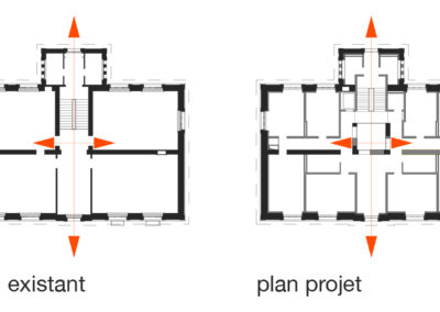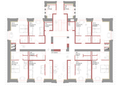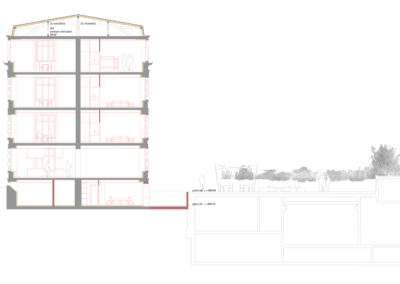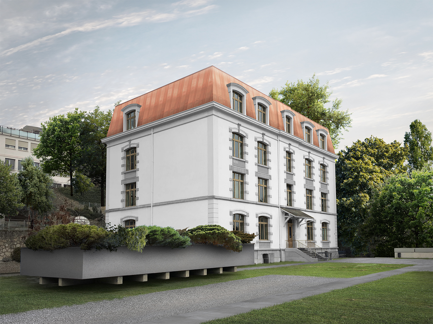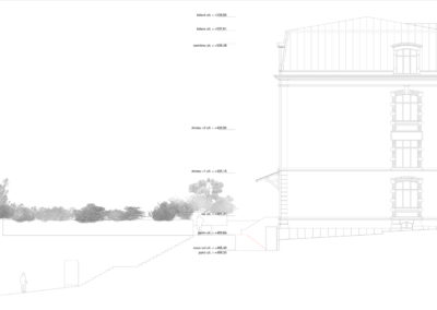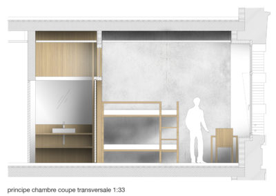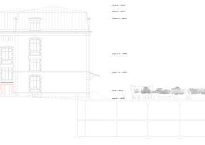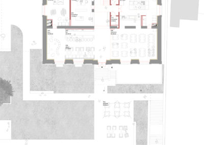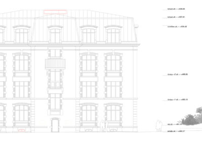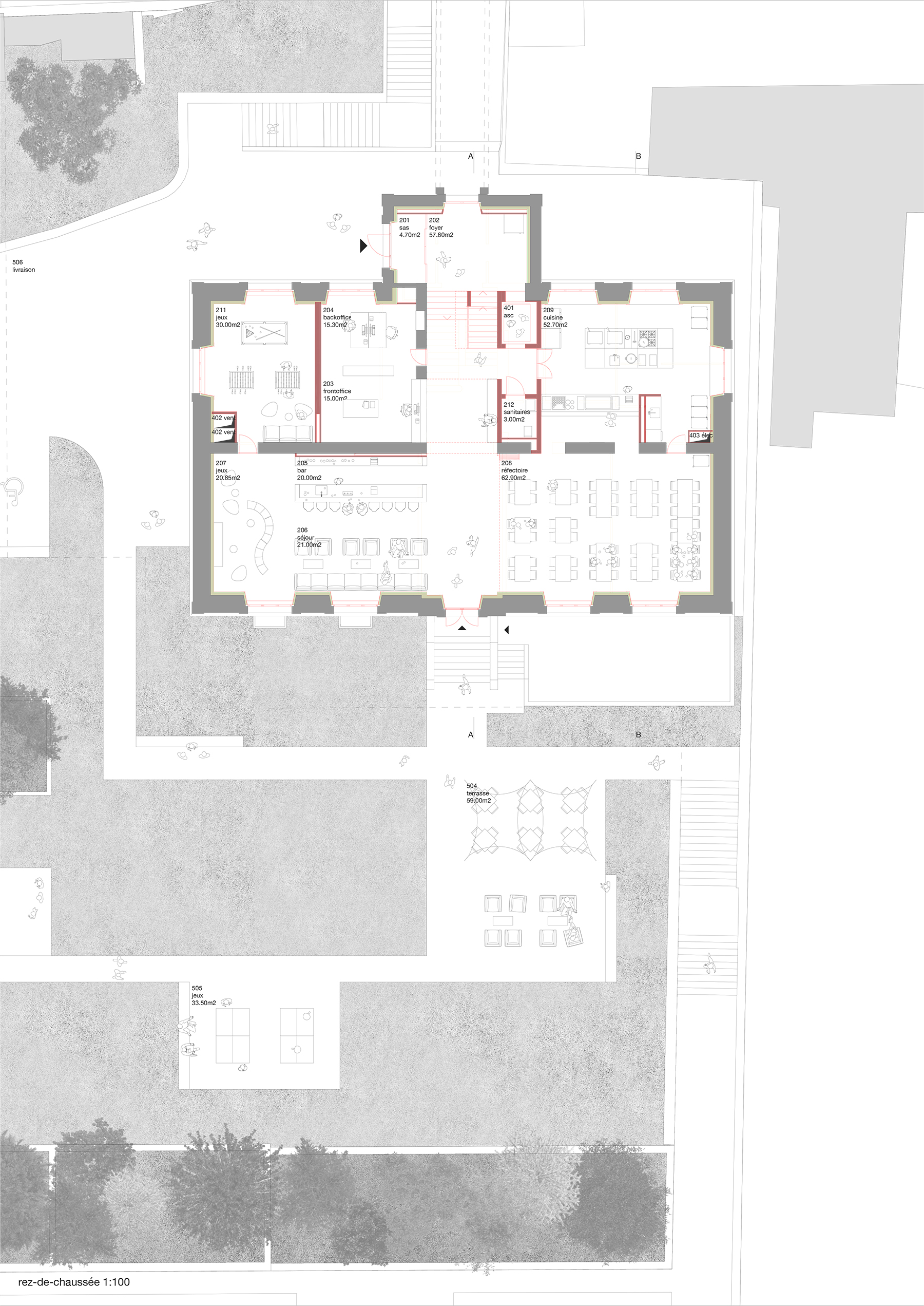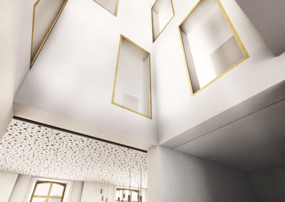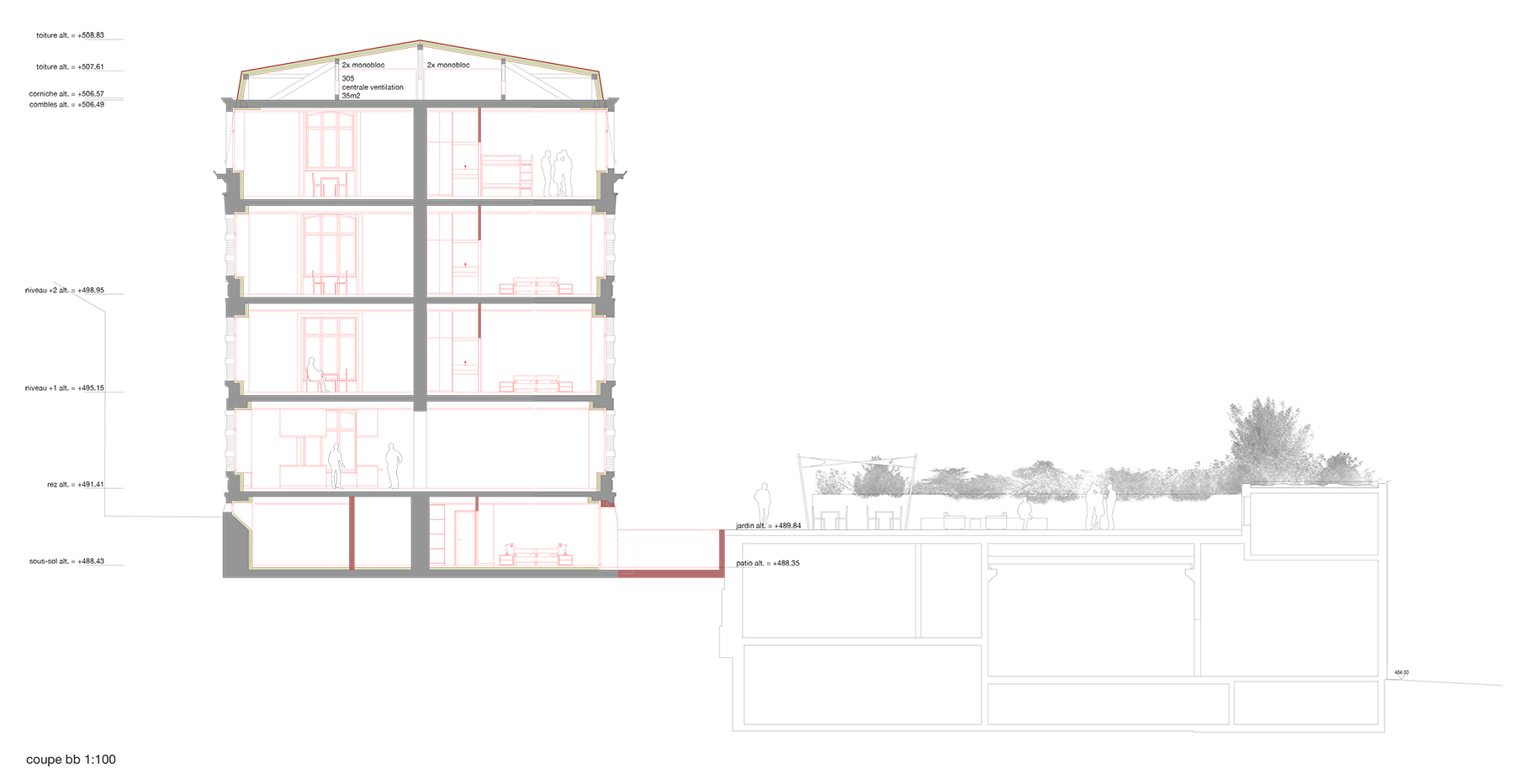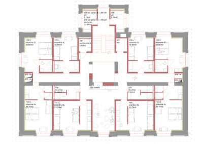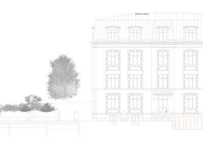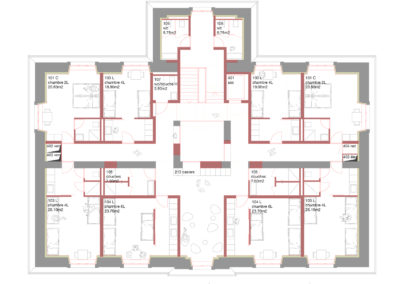 Le projet prend le parti de faire entrer la lumière au centre du bâtiment par la création d’un atrium central regroupant les circulations horizontales et verticales. Il permet de favoriser les échanges par l’intermédiaire de jeux de vues créés par les fenêtres intérieures et les zones de rencontre. Le projet garde la trace des structures existantes en renforçant l’axe nord-sud propre au plan initial et conserve la volumétrie du bâtiment existant. La toiture se pare d’une couverture en cuivre pour démarquer le caractère spécifique du type d’ouvrage en rapport avec les bâtiments avoisinants. La couleur cuivre est là pour rappeler la couleur rouge orangée des toitures en terre cuite des bâtiments du quartier du Sablon. Dans les étages les services sont regroupés au centre en formant des noyaux. Outre le fait de rationaliser les gaines techniques, ce dispositif permet de créer une zone « tampon », semi-privée entre le couloir et la chambre, garantissant ainsi une certaine intimité lors du change et de la toilette. Les aménagements extérieurs s’inscrivent dans un esprit de parc sur un socle rappelant la topographie en murs de vignes du quartier.