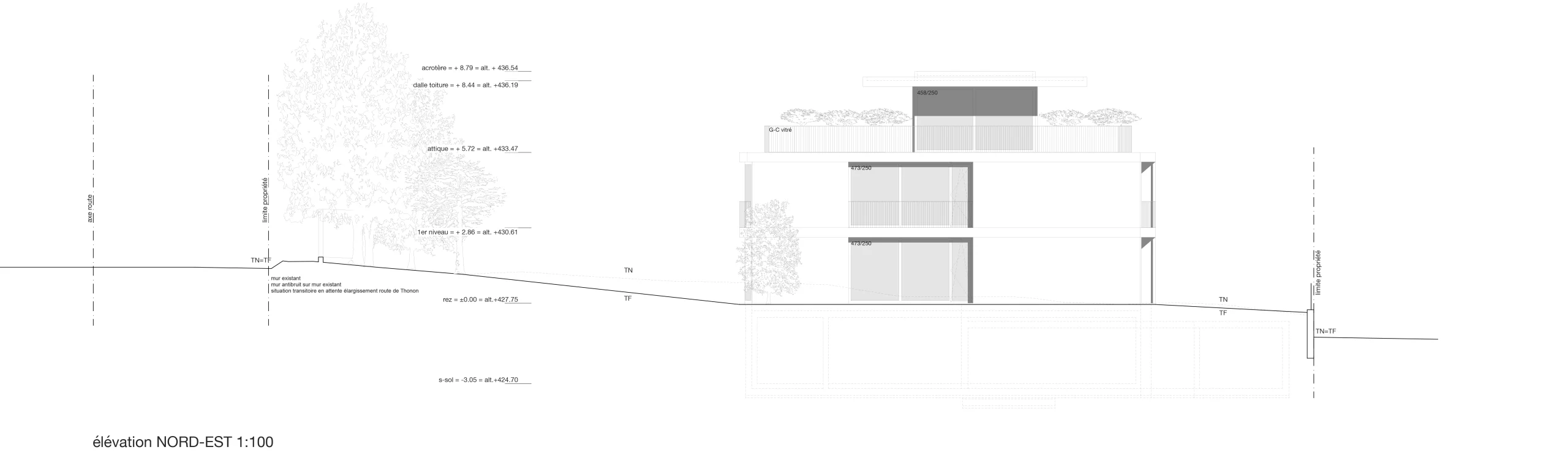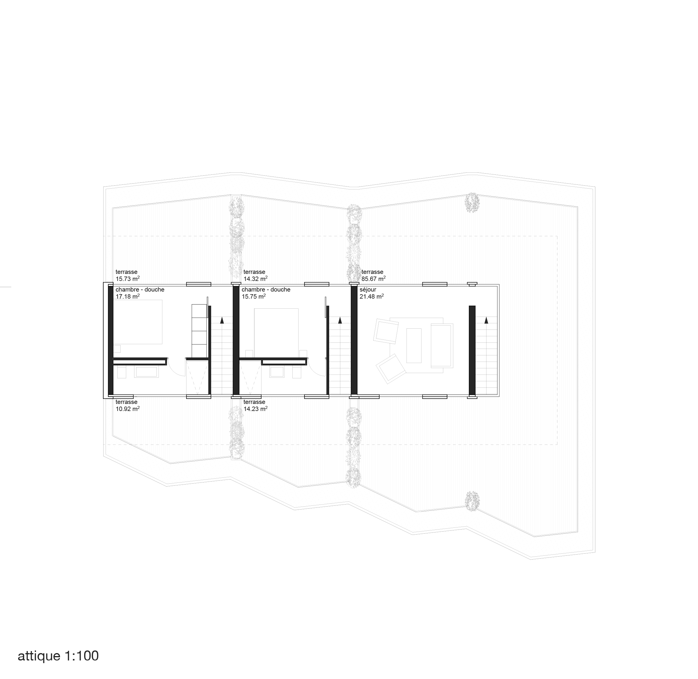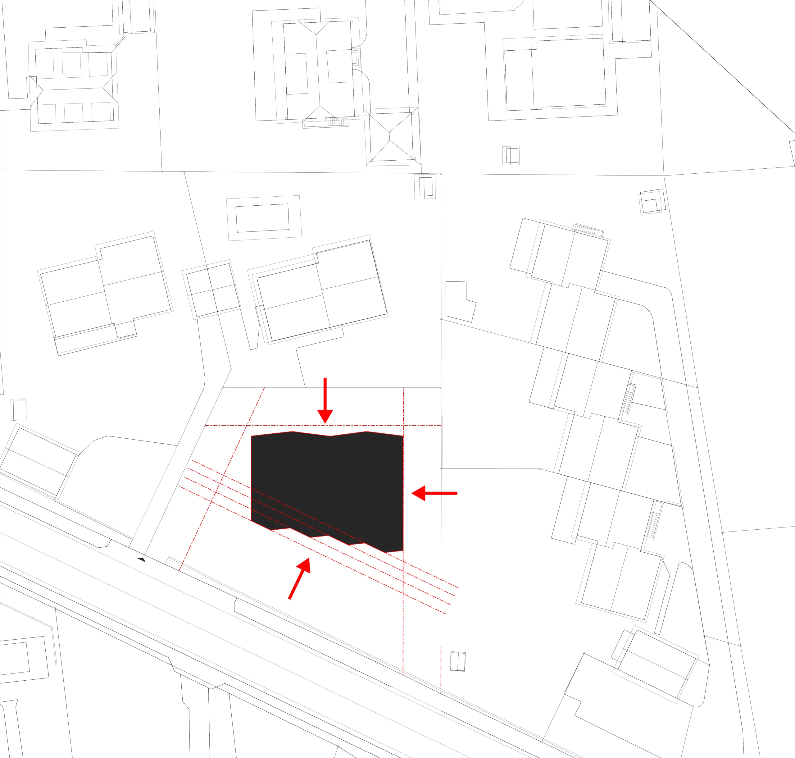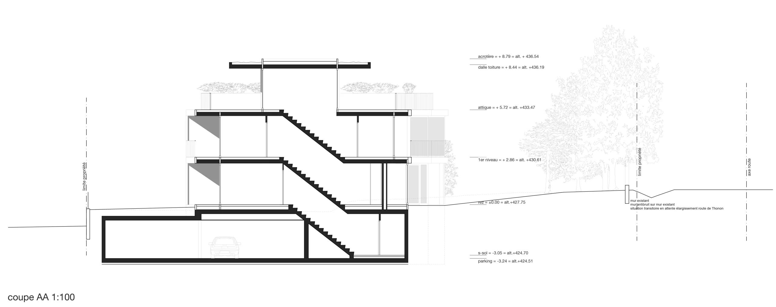 L’implantation du bâtiment reprend les orientations majoritaires du tissu bâti environnant à l’échelle du petit territoire. Il crée un élément charnière effectuant la transition entre un axe de communication principal et la zone résidentielle. Les lots sont organisés sur 2 niveaux + attique en 4 lames verticales accolées, sorte de townhouses, et assument le milieu périurbain dans lequel ils s’inscrivent. Le choix d’une structure par lames latérales portantes et l’organisation intérieure avec les noyaux et circulations au centre permettent d’assurer une flexibilité dans l’aménagement intérieur. Les angles et renfoncements des façades ont pour but d’éviter la vision d’un élément linéaire de type barre d’immeuble en créant des ombres et des animations tout en assumant la connotation hybride de ce type de construction, villa-immeuble ou maison de ville. Ils effectuent la transition avec la zone résidentielle. Leur fonction est de limiter la réverbération des nuisances liées au bruit routier de la route de Thonon telle que pourrait l’être une surface linéaire en mur continu.