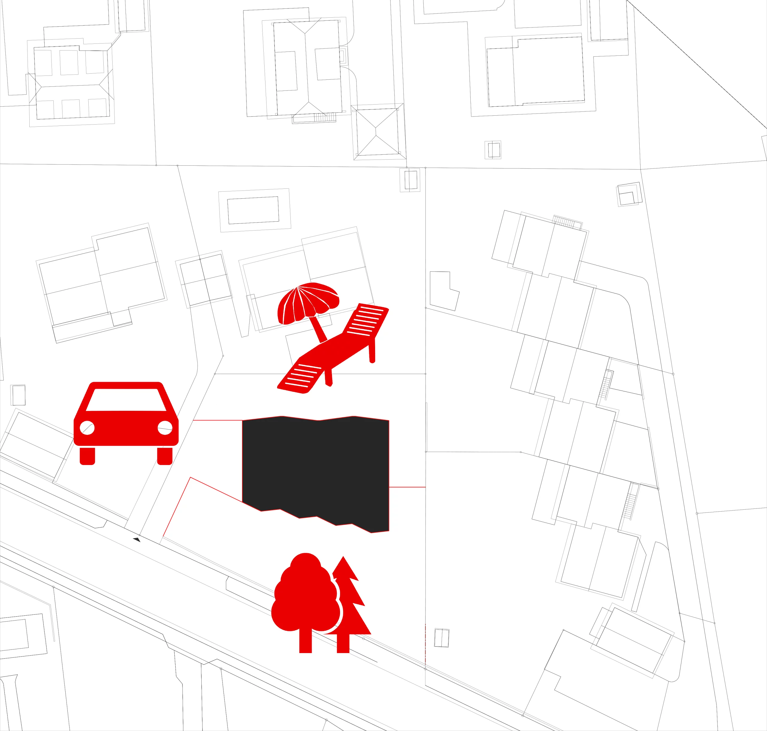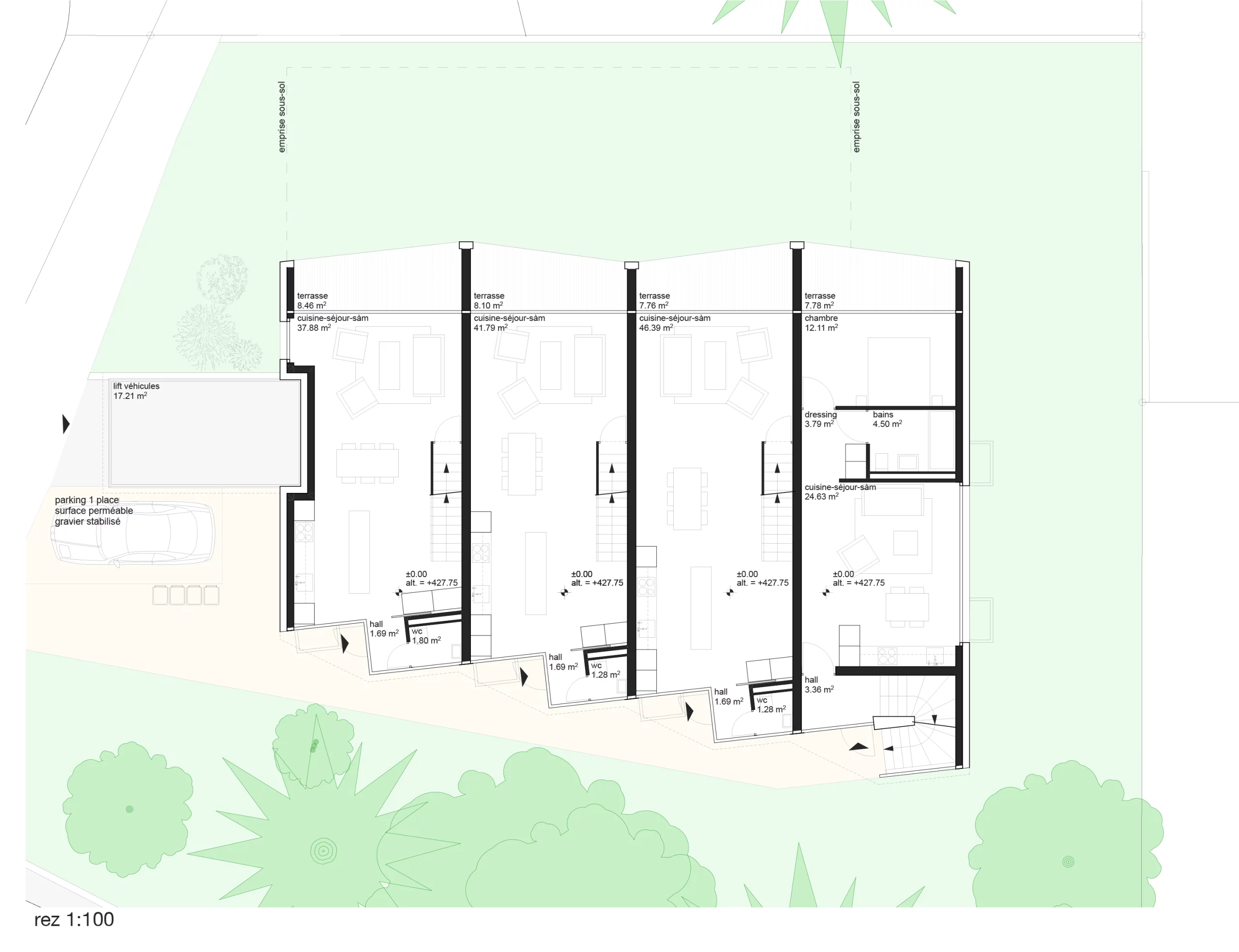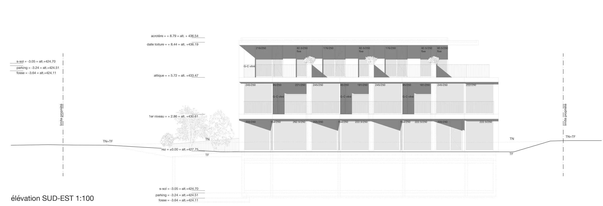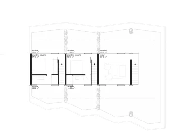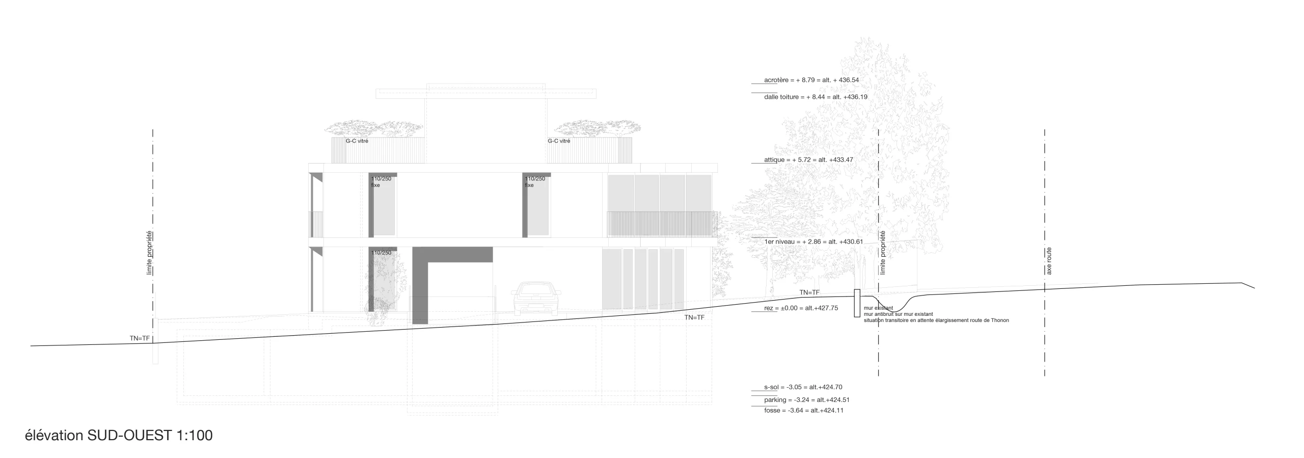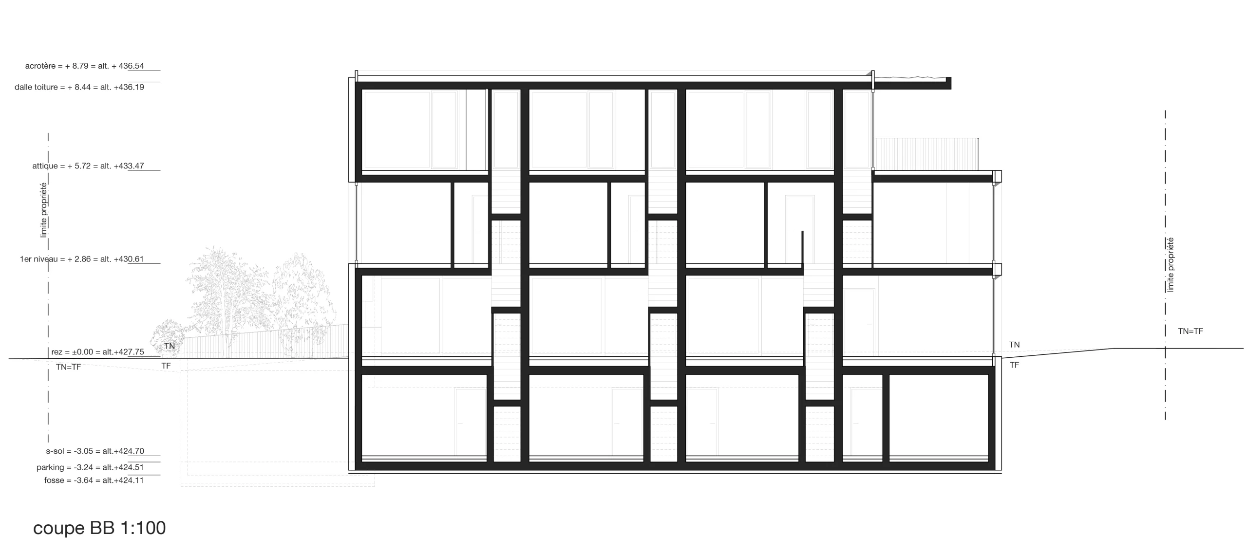 L’implantation du bâtiment reprend les orientations majoritaires du tissu bâti environnant à l’échelle du petit territoire. Il crée un élément charnière effectuant la transition entre un axe de communication principal et la zone résidentielle. Les lots sont organisés sur 2 niveaux + attique en 4 lames verticales accolées, sorte de townhouses, et assument le milieu périurbain dans lequel ils s’inscrivent. Le choix d’une structure par lames latérales portantes et l’organisation intérieure avec les noyaux et circulations au centre permettent d’assurer une flexibilité dans l’aménagement intérieur. Les angles et renfoncements des façades ont pour but d’éviter la vision d’un élément linéaire de type barre d’immeuble en créant des ombres et des animations tout en assumant la connotation hybride de ce type de construction, villa-immeuble ou maison de ville. Ils effectuent la transition avec la zone résidentielle. Leur fonction est de limiter la réverbération des nuisances liées au bruit routier de la route de Thonon telle que pourrait l’être une surface linéaire en mur continu.