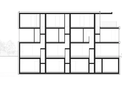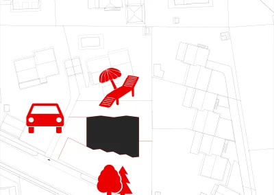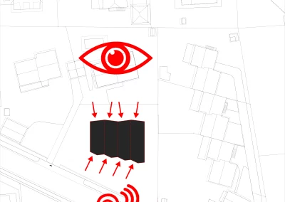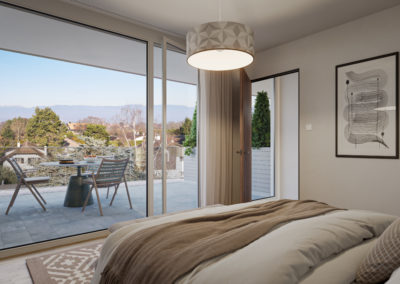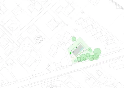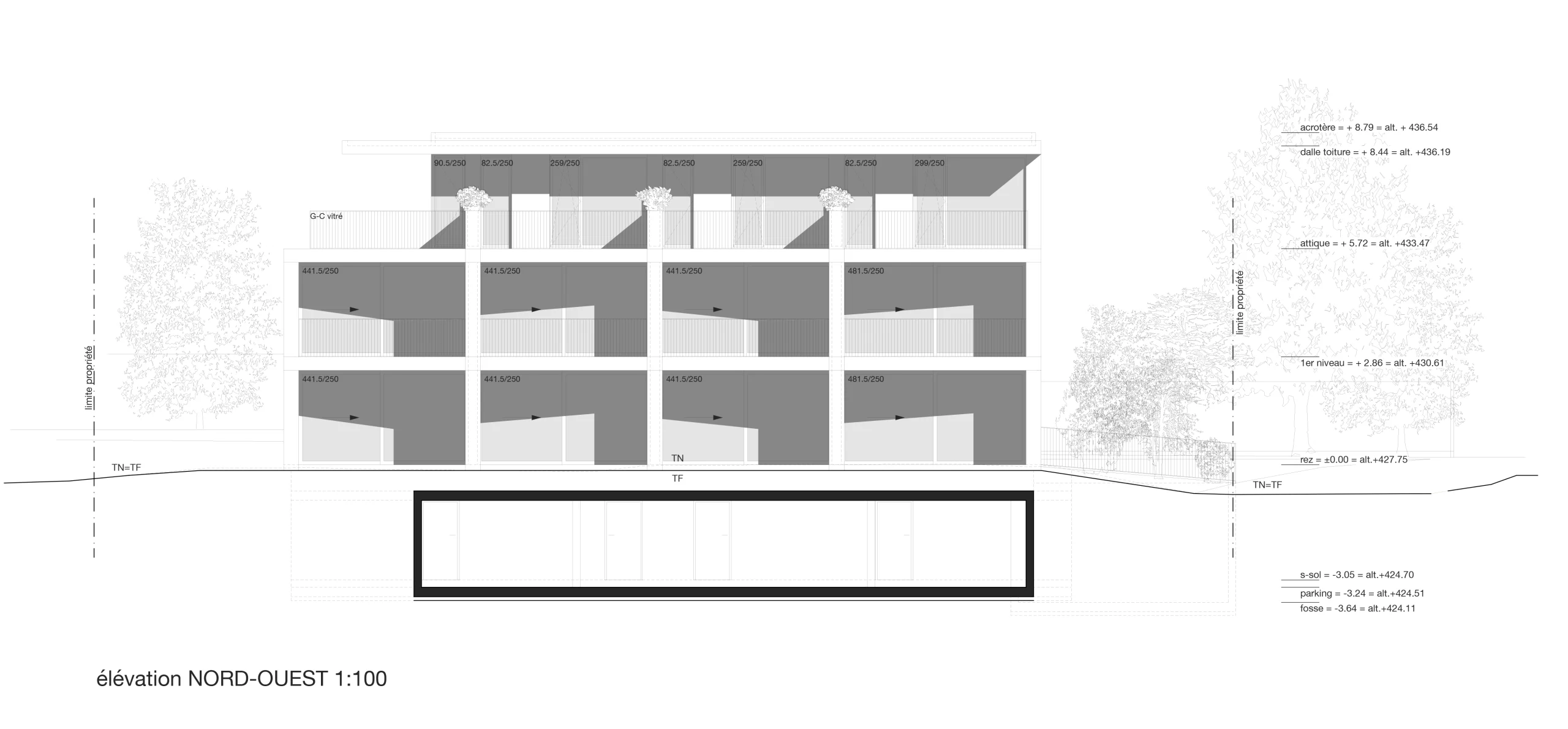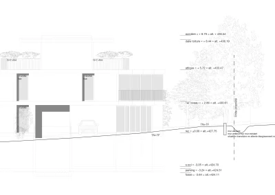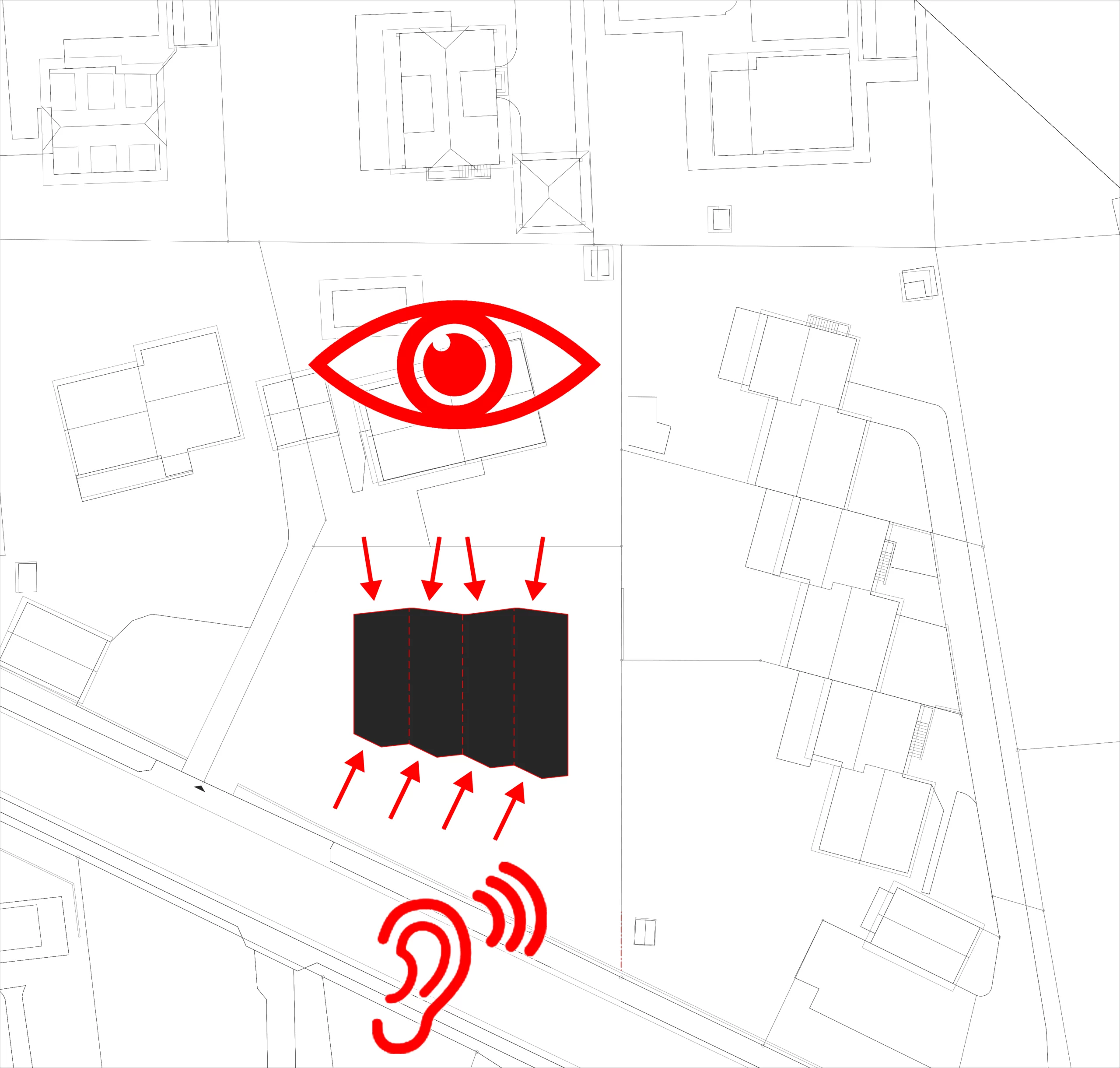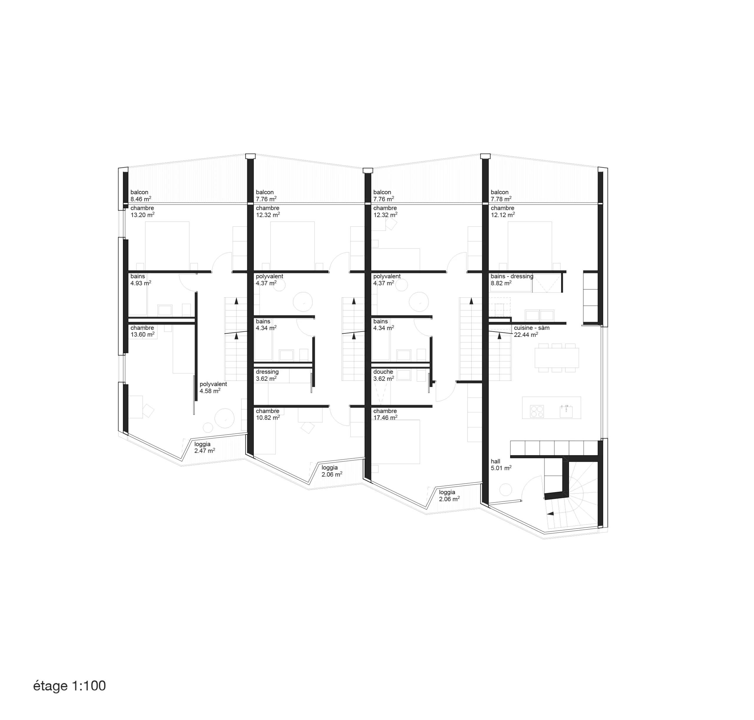 L’implantation du bâtiment reprend les orientations majoritaires du tissu bâti environnant à l’échelle du petit territoire. Il crée un élément charnière effectuant la transition entre un axe de communication principal et la zone résidentielle. Les lots sont organisés sur 2 niveaux + attique en 4 lames verticales accolées, sorte de townhouses, et assument le milieu périurbain dans lequel ils s’inscrivent. Le choix d’une structure par lames latérales portantes et l’organisation intérieure avec les noyaux et circulations au centre permettent d’assurer une flexibilité dans l’aménagement intérieur. Les angles et renfoncements des façades ont pour but d’éviter la vision d’un élément linéaire de type barre d’immeuble en créant des ombres et des animations tout en assumant la connotation hybride de ce type de construction, villa-immeuble ou maison de ville. Ils effectuent la transition avec la zone résidentielle. Leur fonction est de limiter la réverbération des nuisances liées au bruit routier de la route de Thonon telle que pourrait l’être une surface linéaire en mur continu.