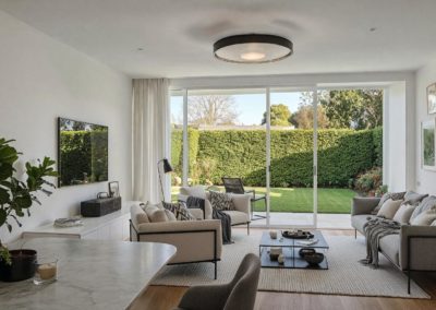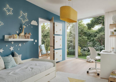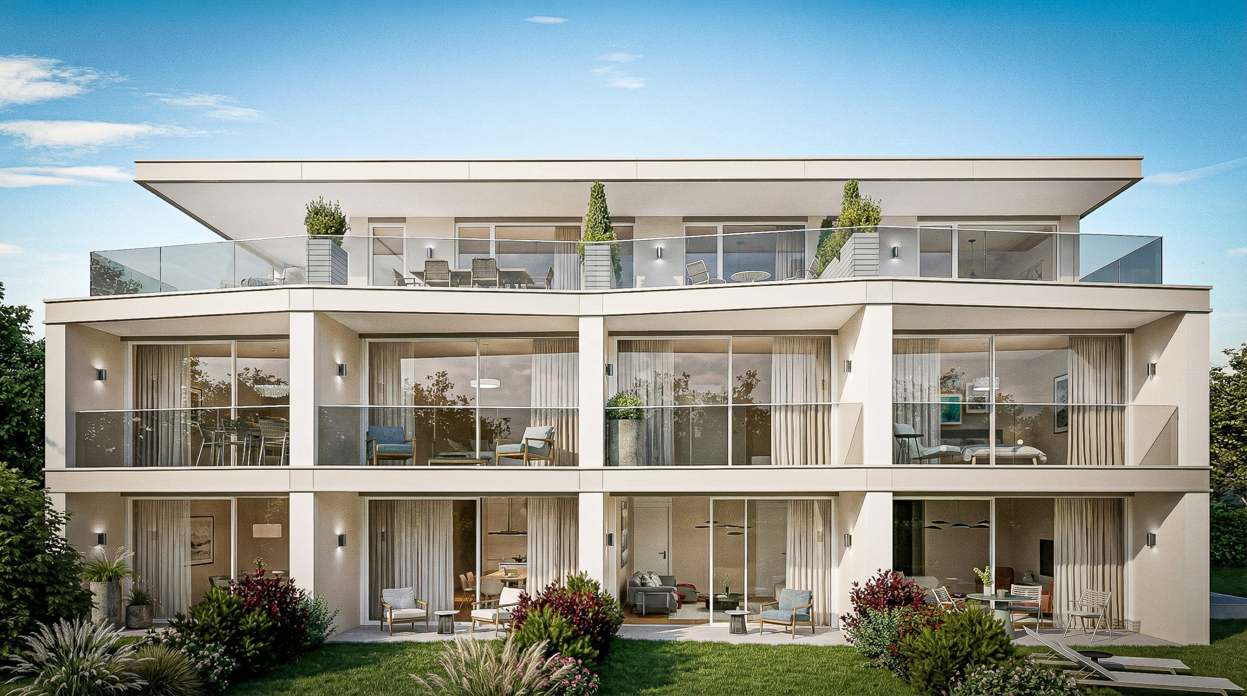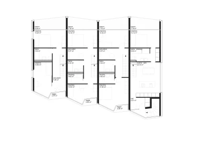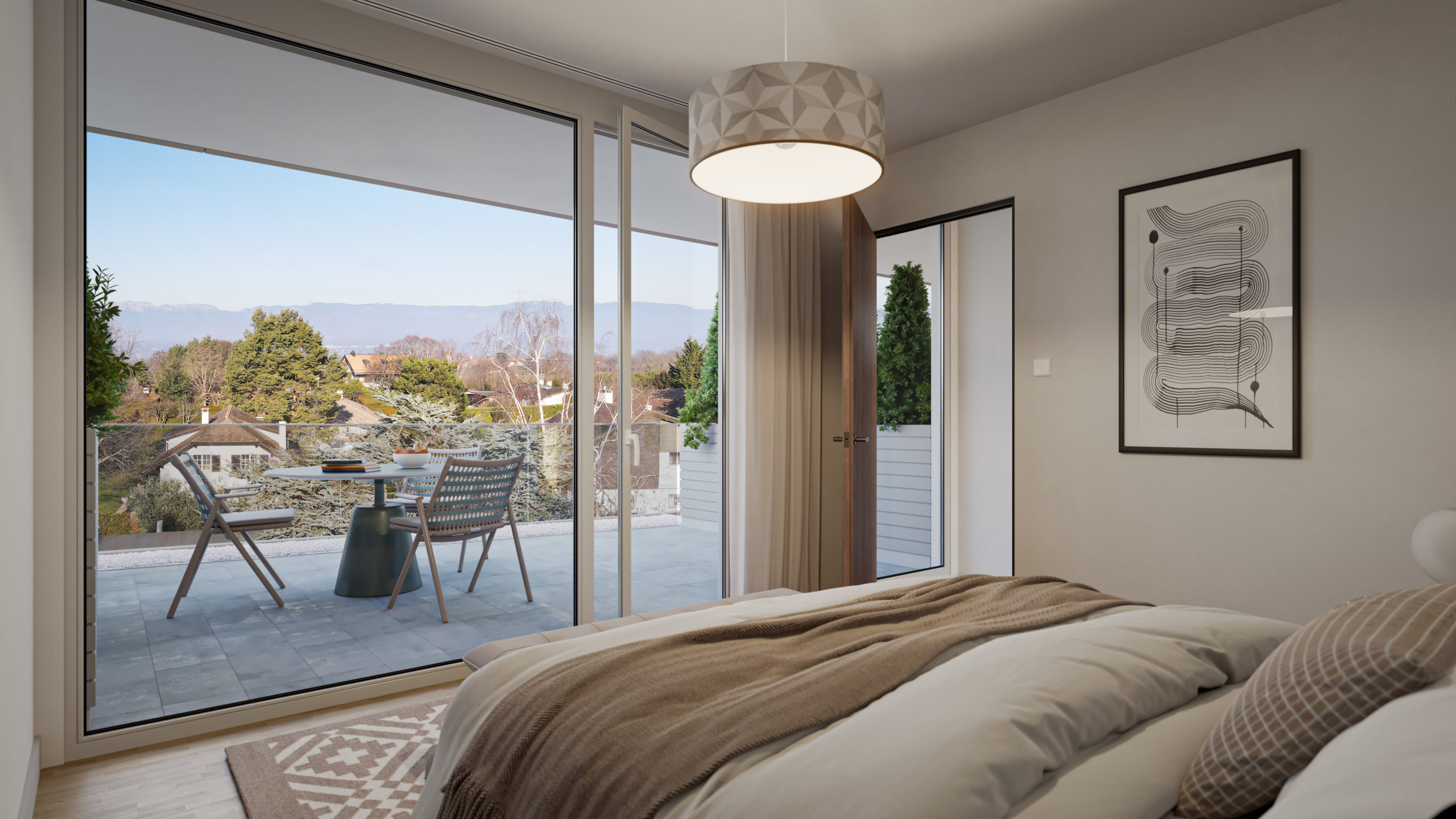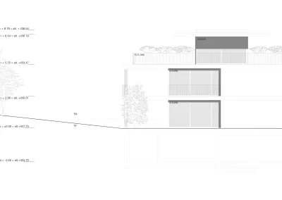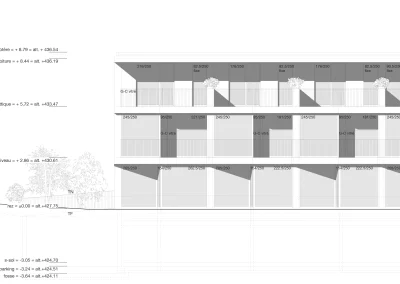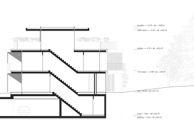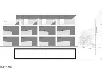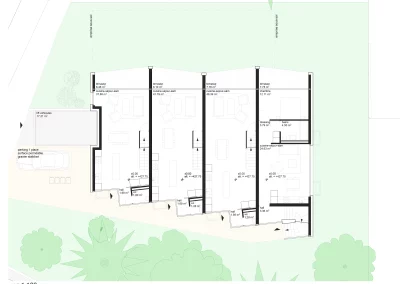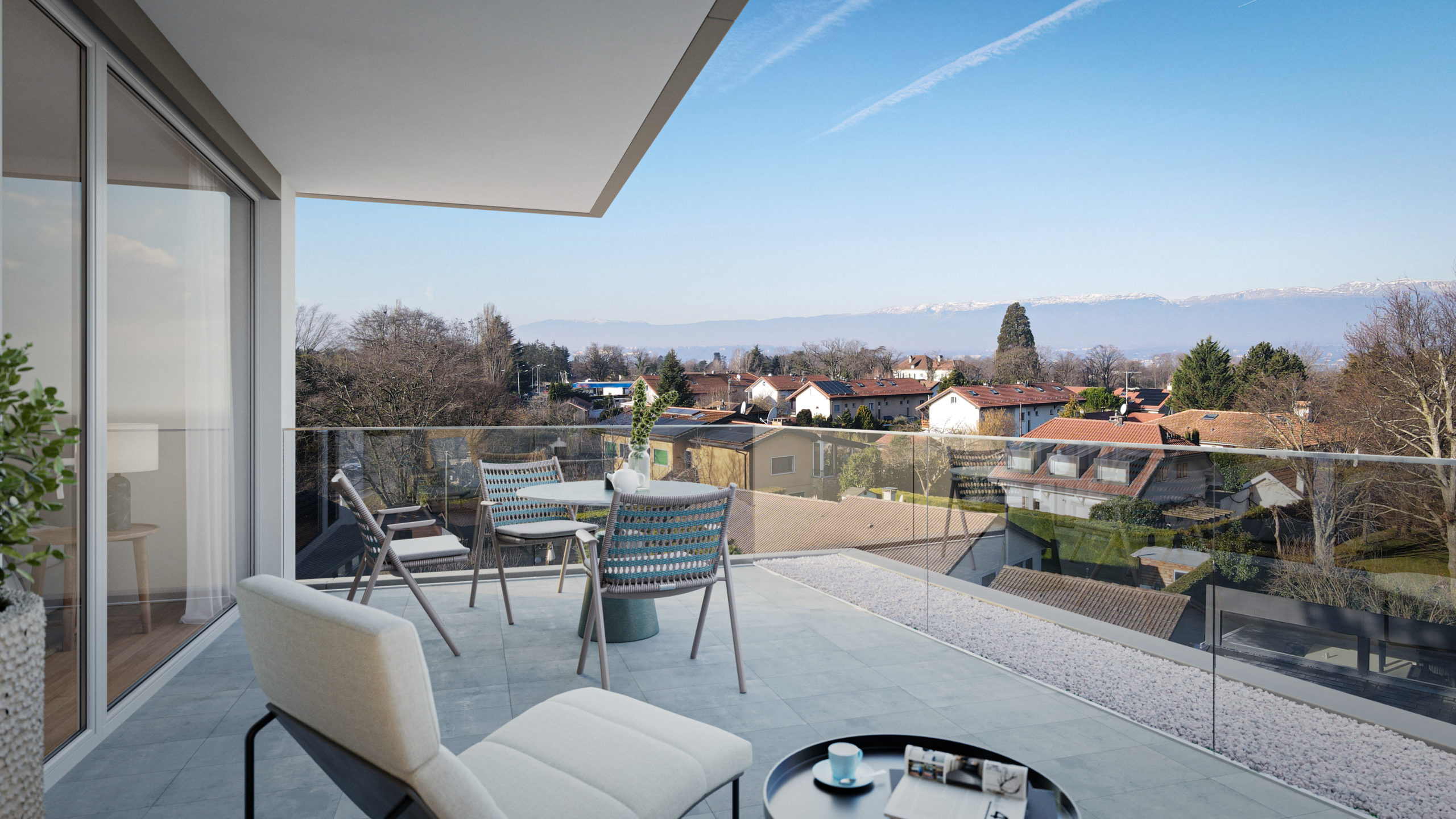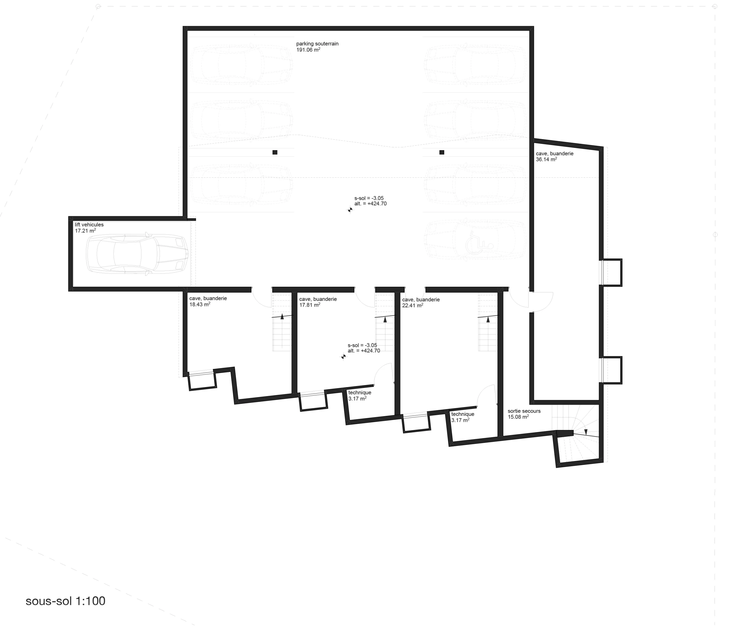 L’implantation du bâtiment reprend les orientations majoritaires du tissu bâti environnant à l’échelle du petit territoire. Il crée un élément charnière effectuant la transition entre un axe de communication principal et la zone résidentielle. Les lots sont organisés sur 2 niveaux + attique en 4 lames verticales accolées, sorte de townhouses, et assument le milieu périurbain dans lequel ils s’inscrivent. Le choix d’une structure par lames latérales portantes et l’organisation intérieure avec les noyaux et circulations au centre permettent d’assurer une flexibilité dans l’aménagement intérieur. Les angles et renfoncements des façades ont pour but d’éviter la vision d’un élément linéaire de type barre d’immeuble en créant des ombres et des animations tout en assumant la connotation hybride de ce type de construction, villa-immeuble ou maison de ville. Ils effectuent la transition avec la zone résidentielle. Leur fonction est de limiter la réverbération des nuisances liées au bruit routier de la route de Thonon telle que pourrait l’être une surface linéaire en mur continu.
