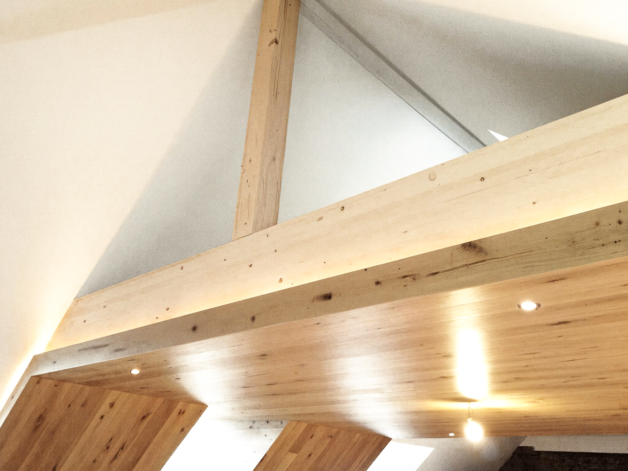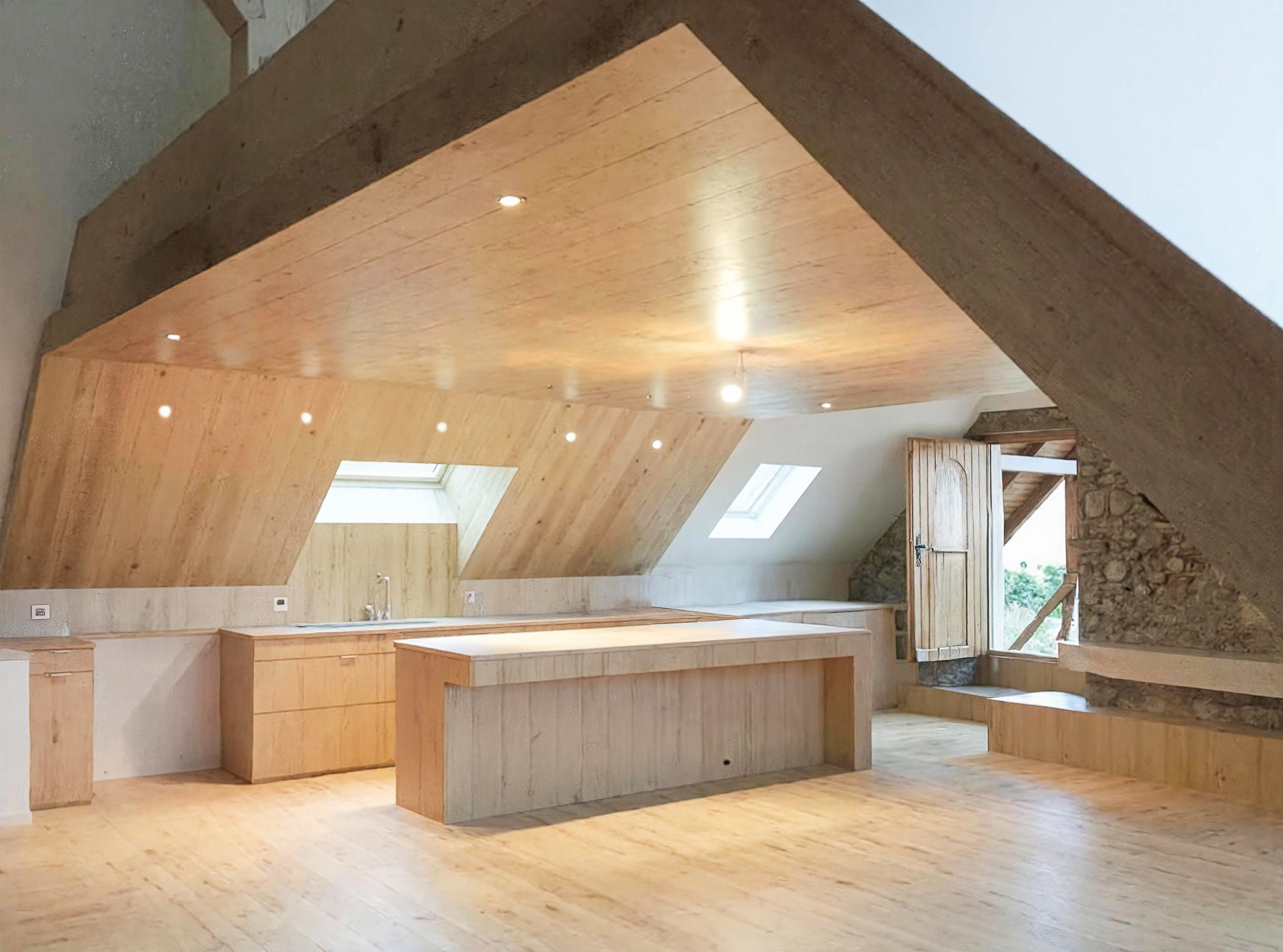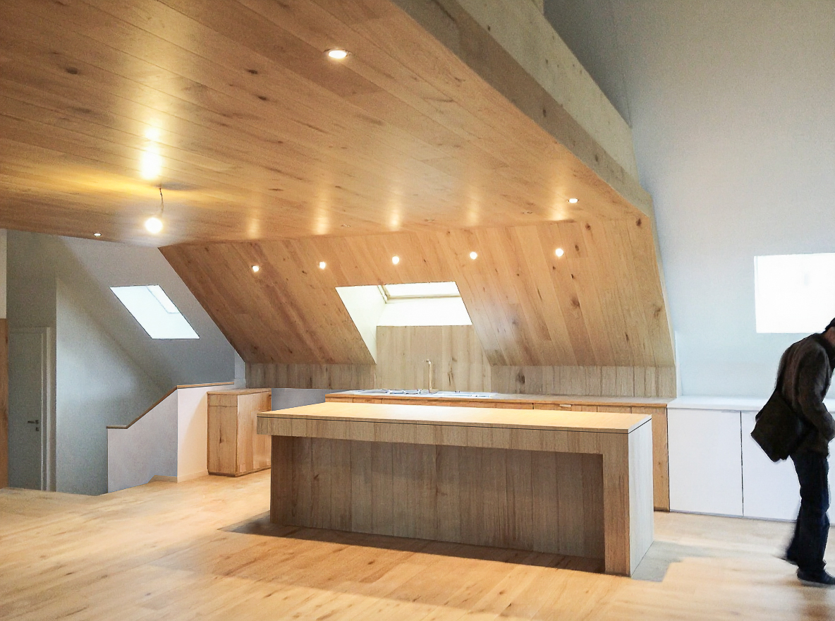 Cette ancienne maison vigneronne située dans le Lavaux date des années 1750, le bâtiment a subi diverses transformations et renforts de fortune au fil du temps. Après un premier constat visuel il apparaît que le bâtiment fait l’objet de gros problèmes structurels. Si l’enveloppe semble en bon état, les plancher eux se sont totalement affaissé de plusieurs centimètres. La faute à un problème de descente de charges non linéaire, en effet sur les quatre poteaux soutenant la charpente, un seul repose sur un mur porteur, ceci ayant pour effet une instabilité sur l’ensemble des plancher de la maison. Le parti pris a été de vider totalement la maison de ses planchers existants et de travailler les nouveaux plancher en bois préfabriqué afin de conserver l’essence originelle de cette maison mais aussi pour ses qualités de facilité et rapidité de mise en œuvre et adaptations sur place. Le projet fait directement référence aux problème structurel il s’agit par l’intermédiaire de deux arches en bois de redistribuer les charges de la charpente sur les murs périphériques. Ces deux arches vont créer une sorte d’anneau délimitant la zone cuisine repas. Cet anneau est accentué par la pose d’un parquet au sol murs et plafonds allant dans le sens des charges alors quand sa périphérie le parquet est posé en sens contraire.