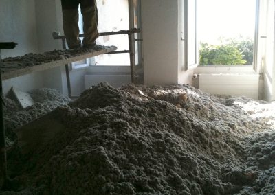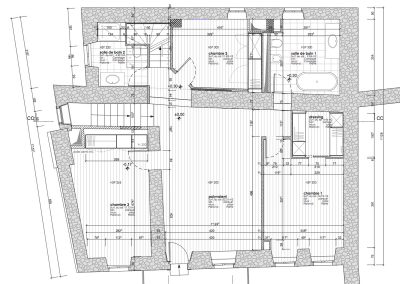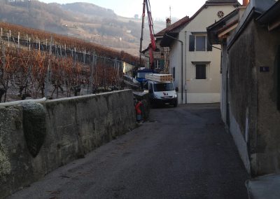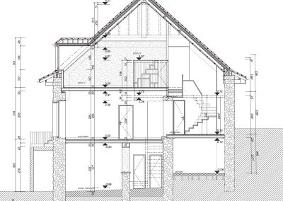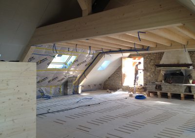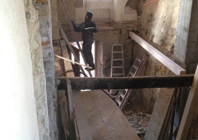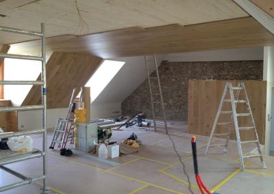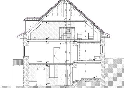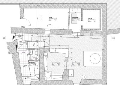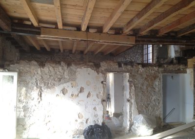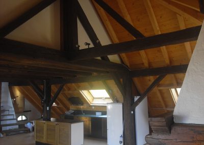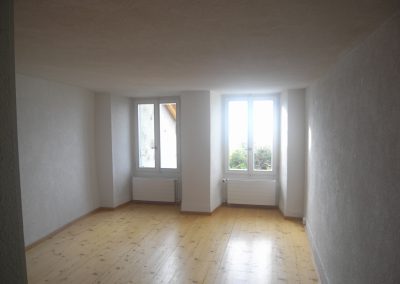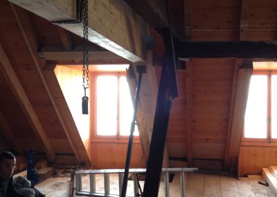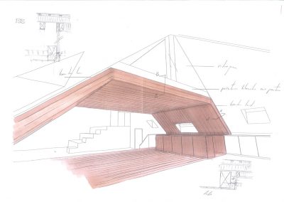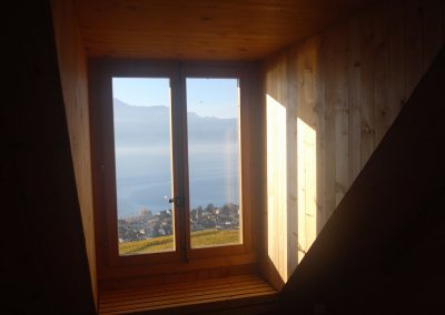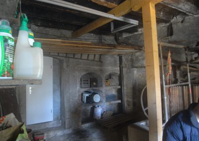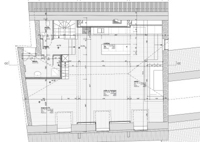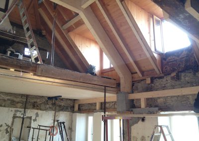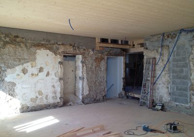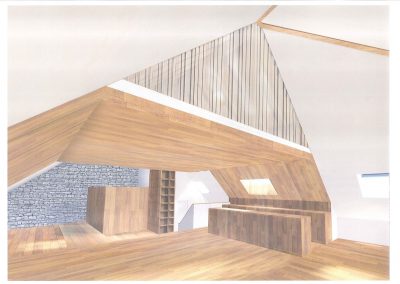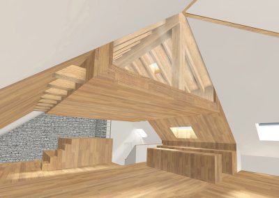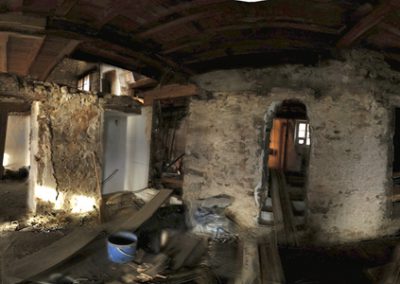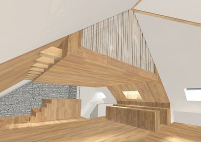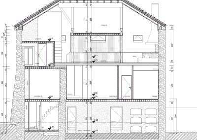Cette ancienne maison vigneronne située dans le Lavaux date des années 1750, le bâtiment a subi diverses transformations et renforts de fortune au fil du temps. Après un premier constat visuel il apparaît que le bâtiment fait l’objet de gros problèmes structurels. Si l’enveloppe semble en bon état, les plancher eux se sont totalement affaissé de plusieurs centimètres. La faute à un problème de descente de charges non linéaire, en effet sur les quatre poteaux soutenant la charpente, un seul repose sur un mur porteur, ceci ayant pour effet une instabilité sur l’ensemble des plancher de la maison. Le parti pris a été de vider totalement la maison de ses planchers existants et de travailler les nouveaux plancher en bois préfabriqué afin de conserver l’essence originelle de cette maison mais aussi pour ses qualités de facilité et rapidité de mise en œuvre et adaptations sur place. Le projet fait directement référence aux problème structurel il s’agit par l’intermédiaire de deux arches en bois de redistribuer les charges de la charpente sur les murs périphériques. Ces deux arches vont créer une sorte d’anneau délimitant la zone cuisine repas. Cet anneau est accentué par la pose d’un parquet au sol murs et plafonds allant dans le sens des charges alors quand sa périphérie le parquet est posé en sens contraire.